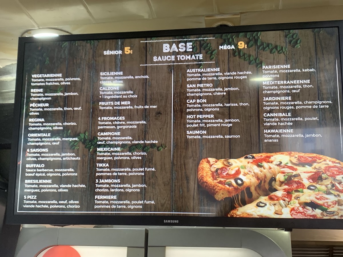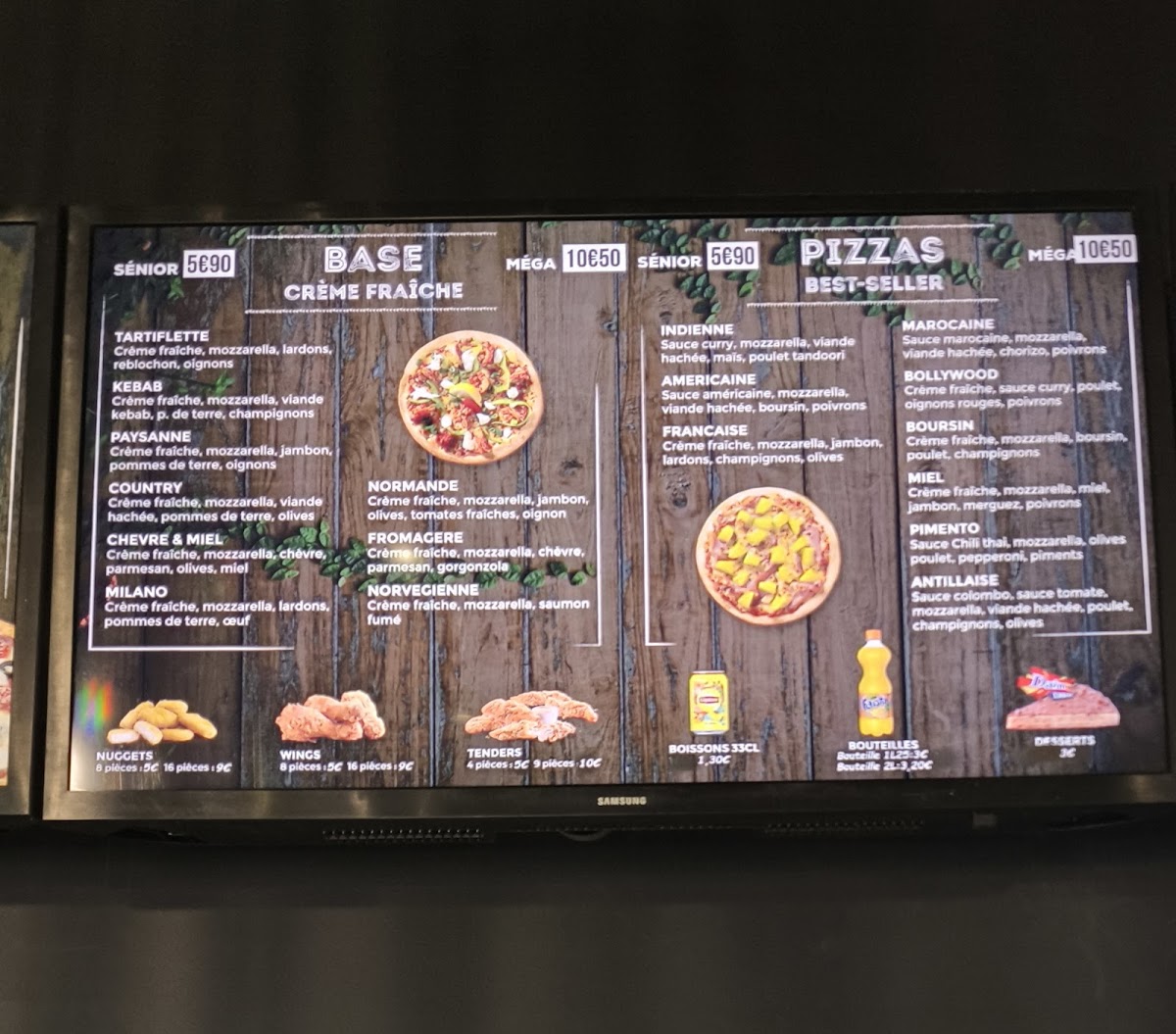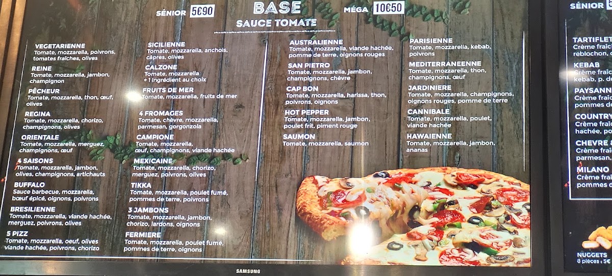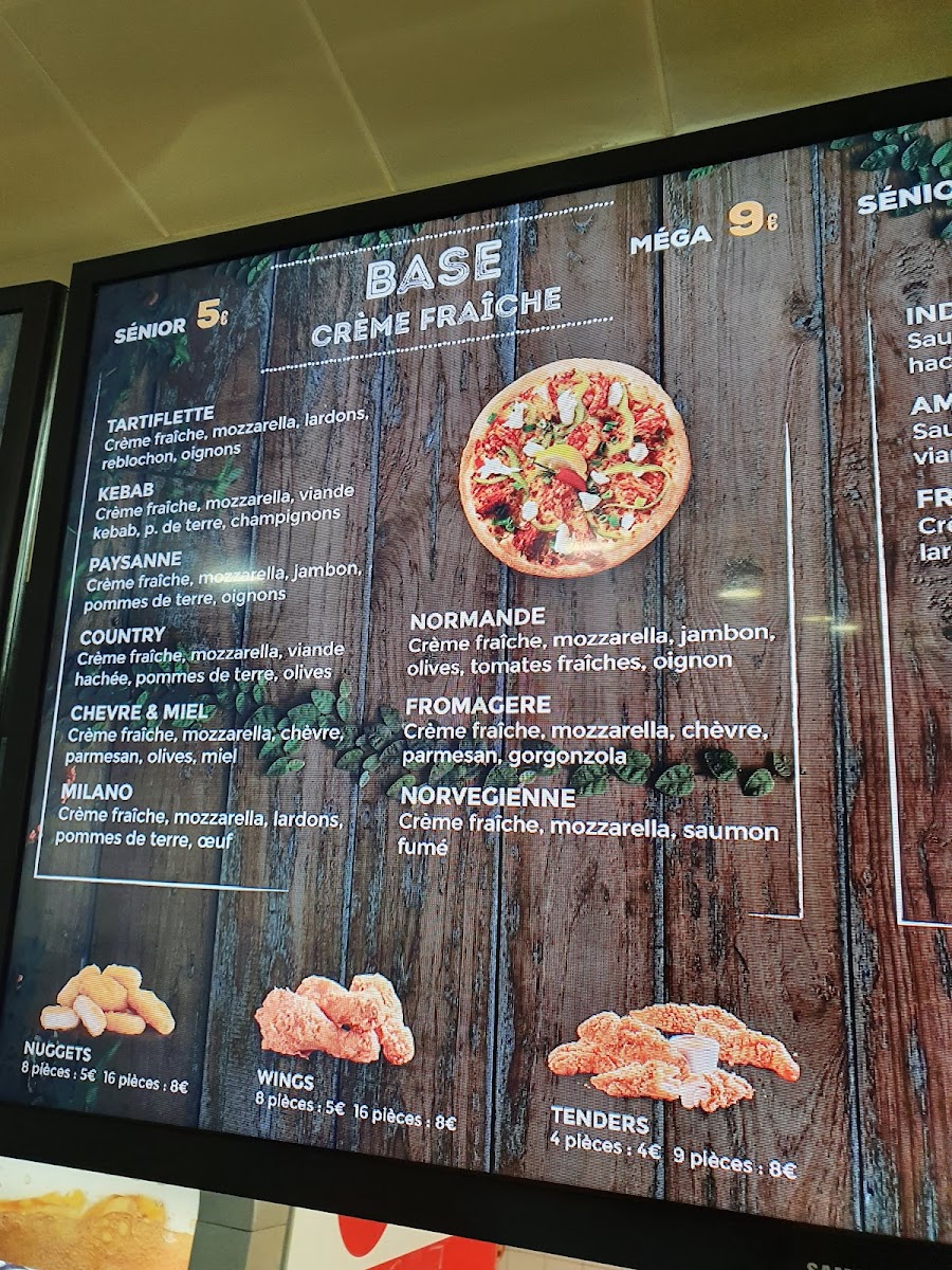The menu primarily features a variety of pizzas, including options such as Pizza Viande Hachée with Crème Fraîche, Pizza Saumon, Pizza 4 Fromages, and a Napolitaine with a Crème Fraîche base. These offerings suggest a focus on traditional and specialty pizzas with diverse toppings and bases.