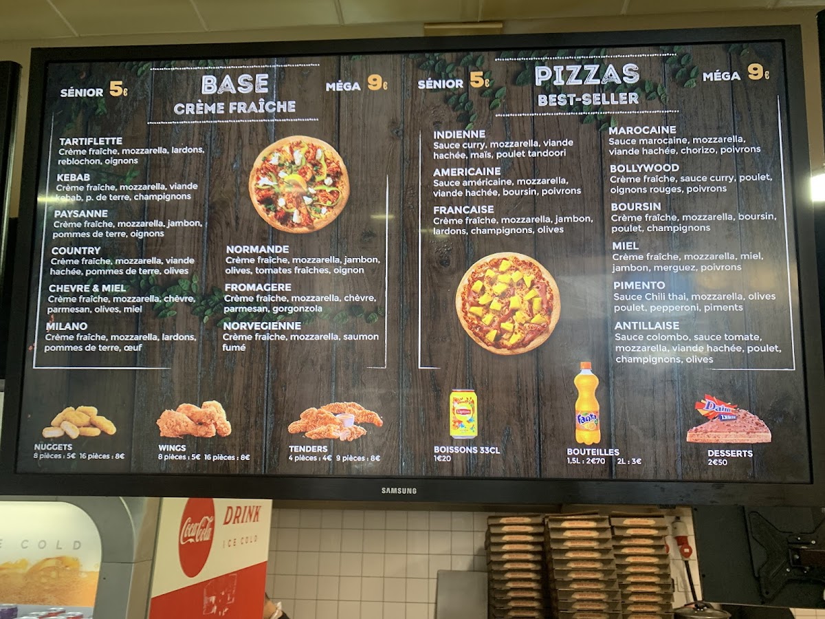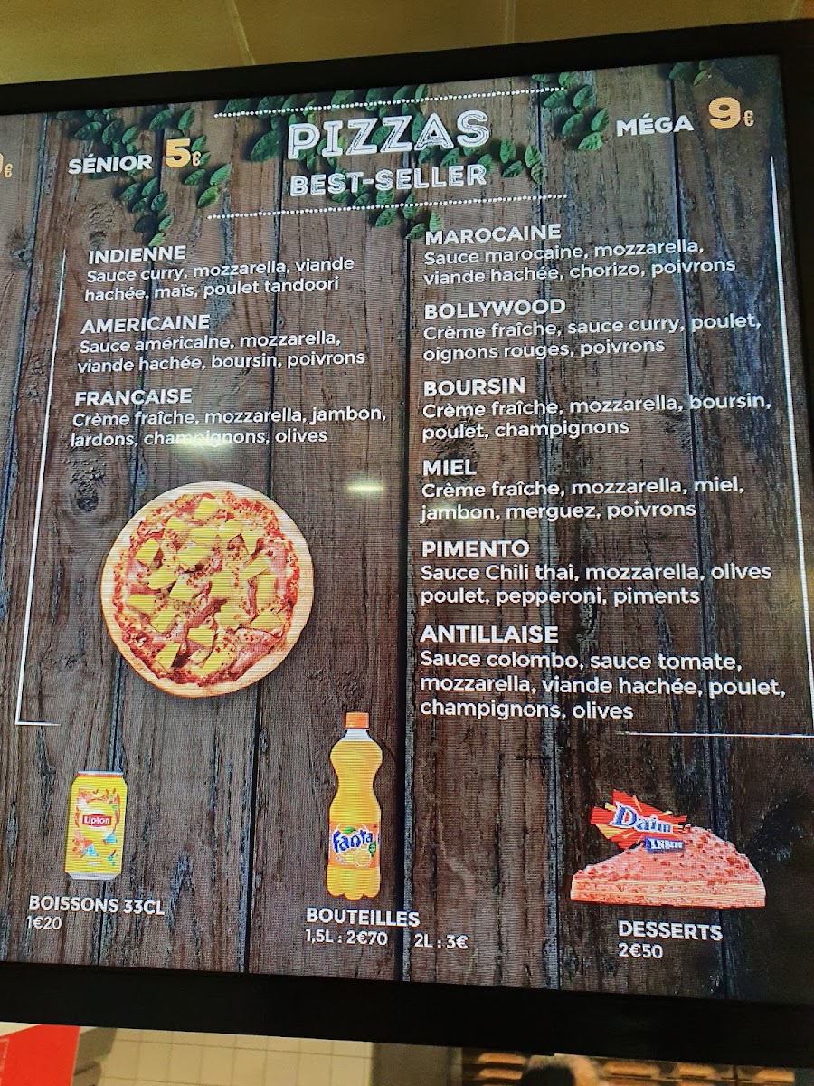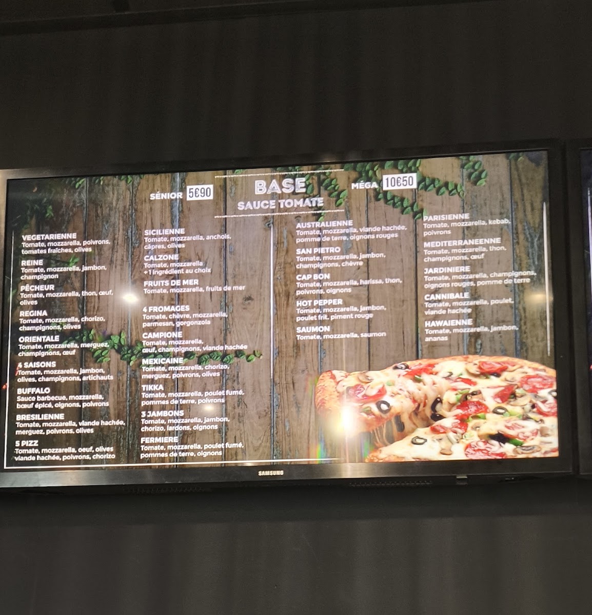 The menu primarily features a variety of pizzas, including options such as Pizza Viande Hachée with Crème Fraîche, Pizza Saumon, Pizza 4 Fromages, and a Napolitaine with a Crème Fraîche base. These offerings suggest a focus on traditional and specialty pizzas with diverse toppings and bases.